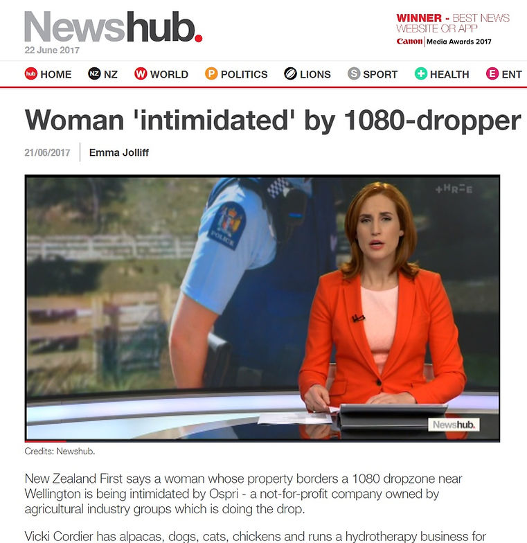 It is common for land owners in New Zealand to be pressured into accepting the poisoning agencies operational procedures - to aerially spread 1080 poison bait close to their homes, and directly into their water supplies. In most cases, down-stream landowners aren't aware that poison baits are dropped directly into their water supplies, or that poisoned animal carcasses may be present for many months following the aerial application of bait.